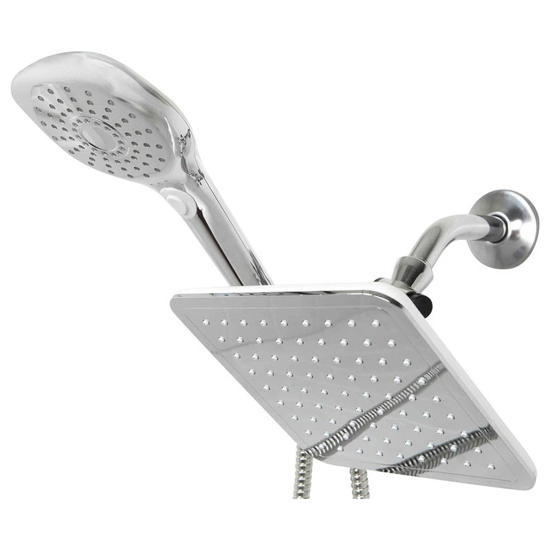 Enjoy a spa-like shower experience with this Shower massager with rainfall shower head combo set. The contemporary rainfall showerhead features 81 nozzles that immerse you into a soothing downpour. Switch between 5 different spray patterns from shower, spray, shower/spray, shower/pulse. The convenient 3-way diverter mount evenly distributes water 5 ft long tangle free hose gives you the control for the ultimate bathing, cleaning and showering experience. Made of chrome plated steel.