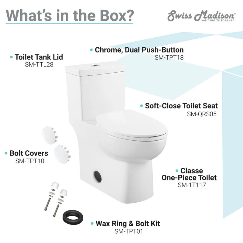 - Includes Tank, Bowl, Seat, Wax Ring, Bolt Kit and Cover Caps