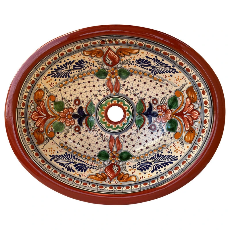 Fine Crafts Imports TalaMex Tecali Oval Multicolor Talavera Ceramic Bathroom Sink. Total depth is 6.5″, but inside depth is 5″. The drain is standard 1.5″ diameter. This Fine Crafts Imports TalaMex Mexican Talavera Ceramic Sink is a beautifully decorated piece made in the traditional way. Highly skilled artisans have been making this type of Ceramic in the city of Puebla for hundreds of years and this particular style is among Mexico’s finest and most intricate work.