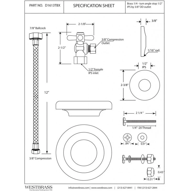 The Westbrass 1/2 in. IPS x 3/8 in OD x 12 in. length brass toilet supply kit makes it easy to outfit your toilet. The kit includes everything required to stylishly supply water to your toilet, including an attractive cross handle angle stop, braided supply line, flange and wax ring. Available in a variety of decorative finishes, this is sure to turn a functional but ugly installation into a complementary work of art.