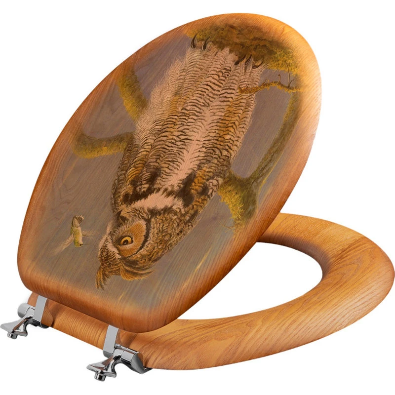 Our oak veneer toilet seats give decorators a way to address an often-overlooked fixture! Available in both round and elongated shapes, this trendsetting line complements our rustic wall art with corresponding themes and imagery. Our finish coating creates a humidity- and mold-resistant surface, meets all industry standards, and passes two important industry tests. Seats come preassembled with chrome hinges, affixed with stainless steel screws. Bumpers are made of high-end neoprene material. Every seat ships with installation hardware.