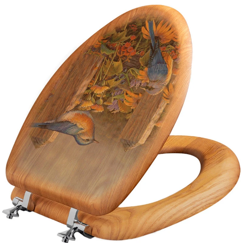 Our oak veneer toilet seats give decorators a way to address an often-overlooked fixture! Available in both round and elongated shapes, this trendsetting line complements our rustic wall art with corresponding themes and imagery. Our finish coating creates a humidity- and mold-resistant surface, meets all industry standards, and passes two important industry tests. Seats come preassembled with chrome hinges, affixed with stainless steel screws. Bumpers are made of high-end neoprene material. Every seat ships with installation hardware.