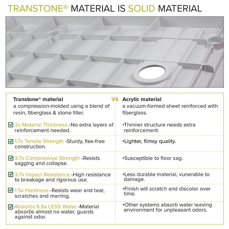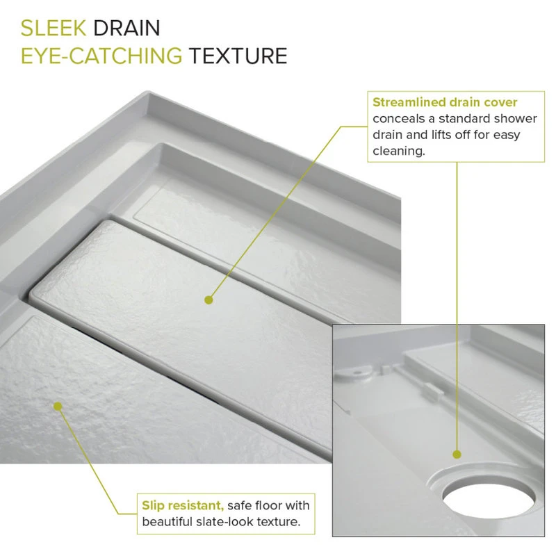Transolid Ultra Low Linear shower bases are the perfect choice to replace an old tub. They are available in 60-in x 30-in and 60-in x 32-in to accommodate traditional tub sizes and the drain measures 8-1/4-in from the wall to line up with an existing tub drain. Made of numerous layers of Transtone, a sheet-molded compound material that is solid throughout the base and is supported by sturdy structural ribs underneath that radiate out from the drain opening. When combined with a thinset mortar installation, this creates a flex-free, water-tight installation and a foundation that you can count on. The base features a 2.6-in ultra-low threshold that is just a smidgen wider to even accommodate popular farmhouse style barn doors. The surface is scratch, impact and slip resistant with a beautiful slate finish for a minimalist look.