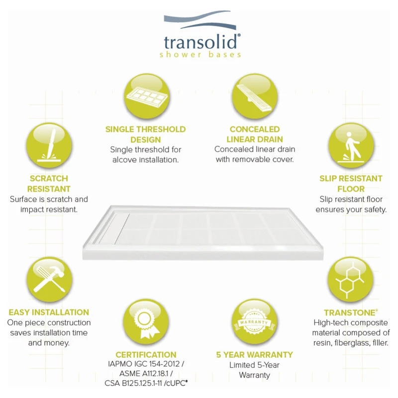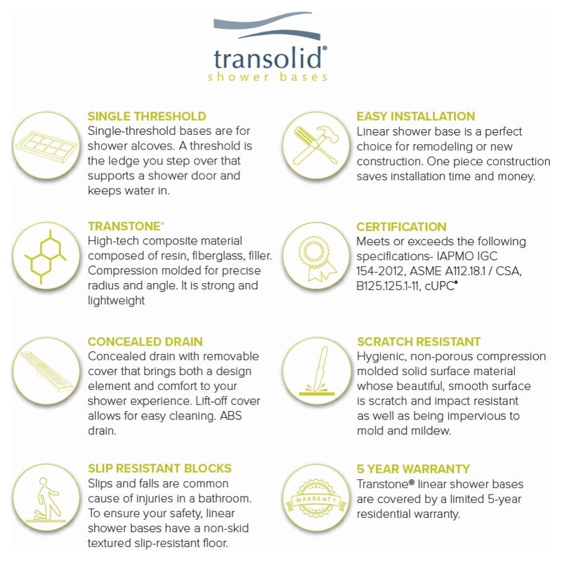 - Easy installation makes this linear shower base the perfect choice for remodeling or new construction