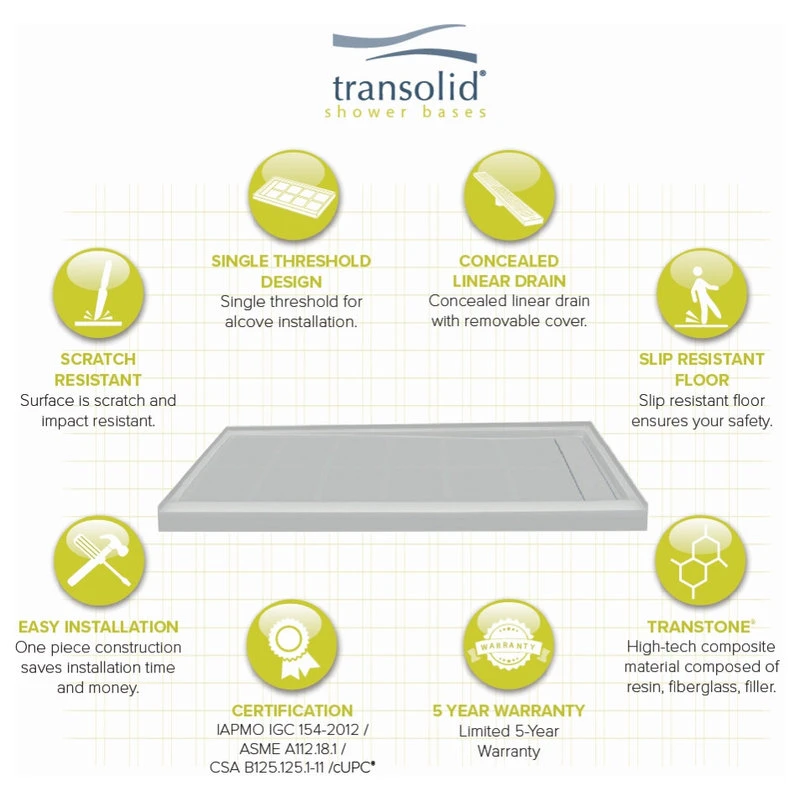 - Contains a single-threshold base to support a shower door and keep water in