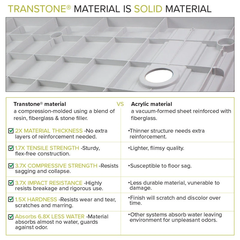 Transolid Ultra Low shower bases are the perfect choice for your shower renovation. Made of numerous layers of Transtone, a sheet-molded compound material that is solid throughout the base and is supported by sturdy structural ribs underneath that radiate out from the drain opening. When combined with a thinset mortar installation, this creates a flex-free, water-tight installation and a foundation that you can count on. The base features a 2.6-in ultra-low threshold that is just a smidgen wider to even accommodate popular farmhouse style barn doors. The surface is scratch, impact and slip resistant with a beautiful slate finish for a minimalist look.