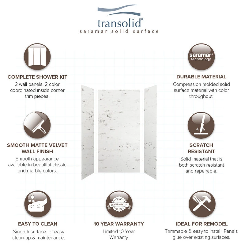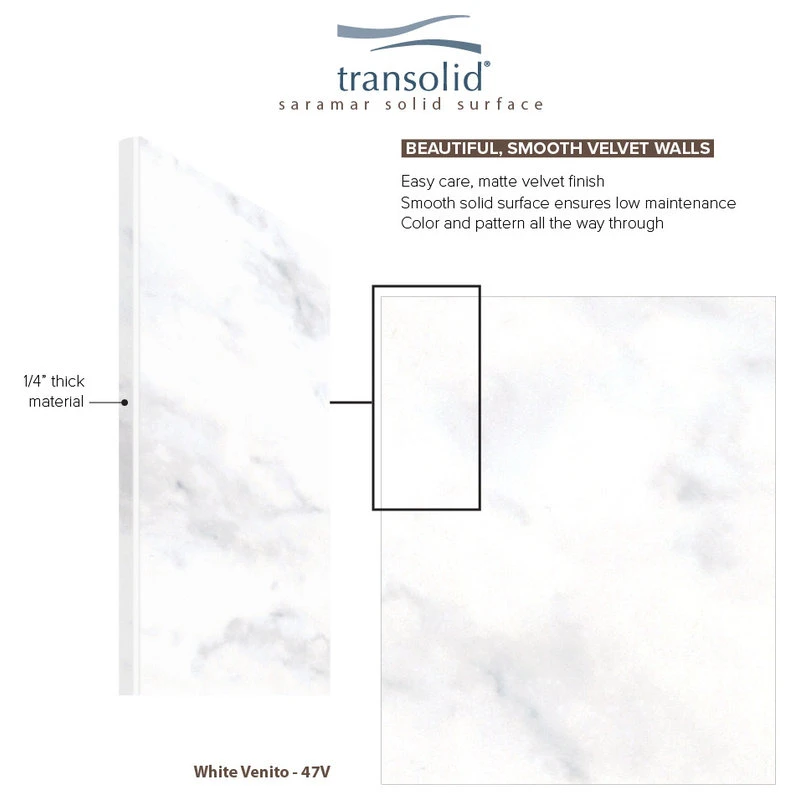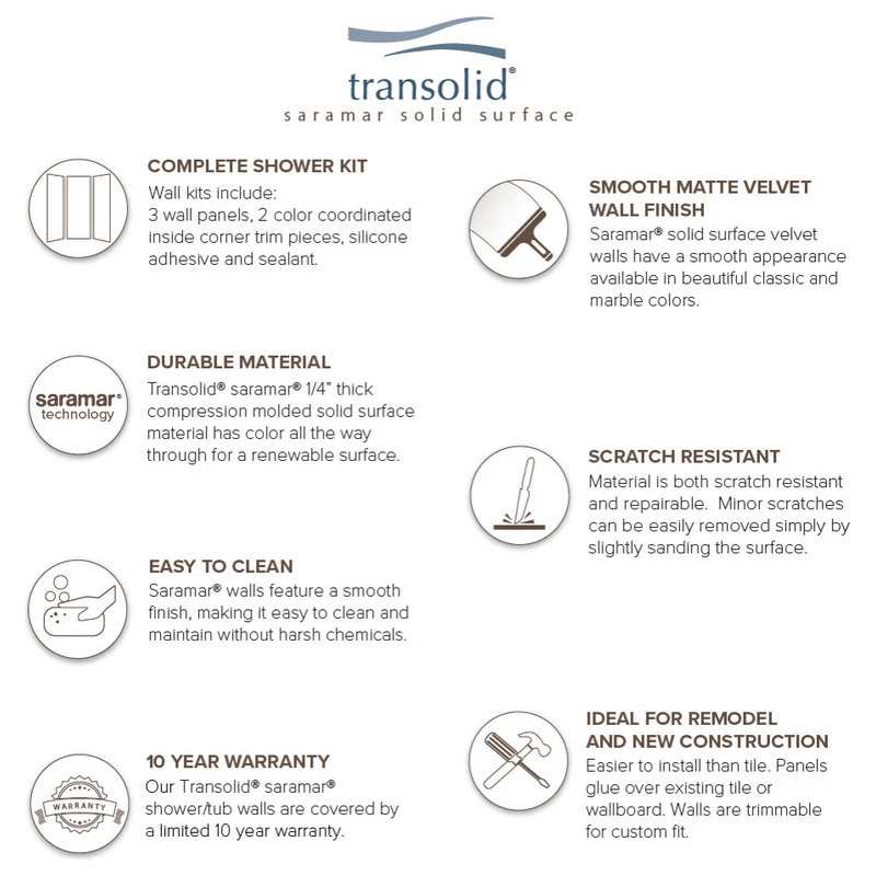 Transolid SaraMar bath and shower wall panels in Velvet finish are characterized by a smooth, matte finish, which offers a unique and modern element that can quickly elevate the design of your bathroom. These walls are ideal for a quick remodel, because there is no messy demolition required, instead, SaraMar walls simply glue right over your existing surface. All Transolid shower walls are backed by a hassle-free 10-year warranty. SaraMar walls are easy-to-clean, durable, and resistant to stain; they work with new and existing construction, they are trimmable to fit any space, and are on trend with the latest colors and patterns. Discover whether these bathroom wall panels are the right choice for you!