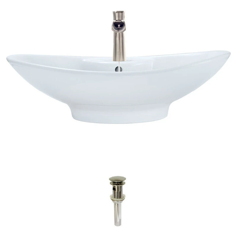 With a curvaceous oval form, this vessel makes a sophisticated statement in the bath. Pre-drilled faucet and overflow holes are located in its bowed platform along the back. **Disclaimer** This vessel is designed with a partially open and/or unfinished back; the faucet hardware/unpolished porcelain may be visible if viewed from behind, or if installed with its back away from a mirrored surface. The additional vitreous china coating on this model creates an even more impervious and sanitary surface than standard porcelain. With an overall measurement of 25 5/8″ x 17″ x 7 3/4″, it will require a minimum-width cabinet of 27″. The 732-BN , single-handle, vessel faucet is a shorter version of the 731, for use with vessel sinks which have pre-drilled faucet platforms. It features a trough-style spout which has a 4″ reach and it stands 6 3/4″ tall. Its sleek lines gradually widen and contract to create a stunning design statement. The single handle reflects the arch of the spout and easily sets just the right water flow and temperature. Ceramic disc cartridges assure long-term, dependable operation, and a beautiful brushed nickel finish completes its distinctive appearance. The faucet is constructed without lead and is compliant with NSF (National Sanitation Foundation) standards, the Safe Drinking Water Act, the cUPC (Uniform Plumbing Code of the United States and Canada), the ADA (American Disabilities Act) and carries the EPAs WaterSense label. Additionally, a spring-loaded, vessel pop-up drain (vpud) is included, which opens and closes with a simple press to its attractive brushed nickel cap.