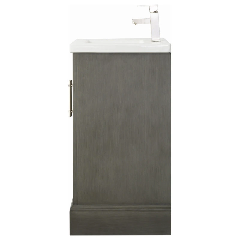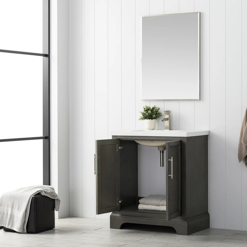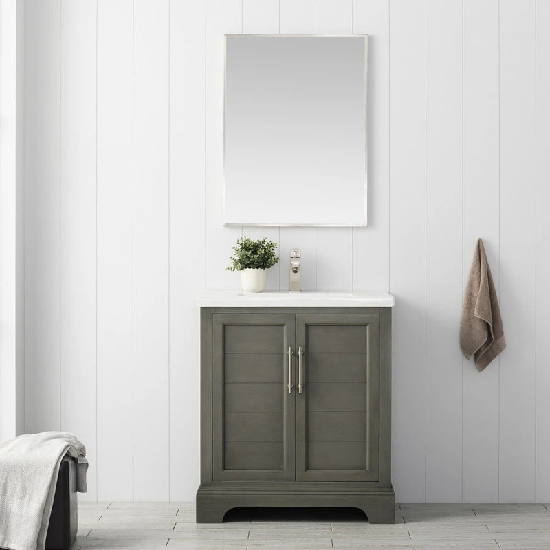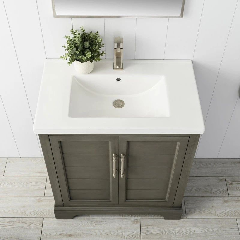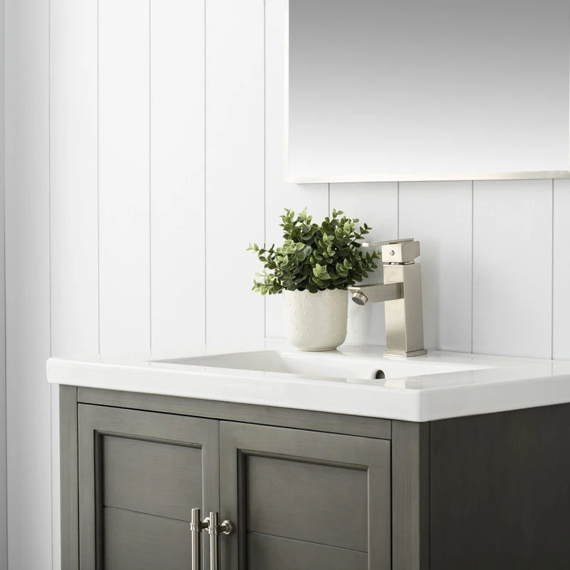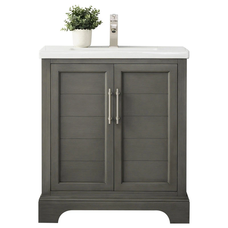 The classic clean lines and elegant styling of the 30-inch 1-hole bathroom vanity will infuse your bathroom with a calming, light, and airy feel. Designed to enhance a smaller size bathroom with a strong contemporary look with big character in a compact size. Beneath a lustrous and durable ceramic countertop is a beautifully integrated rectangular sink. Equipped with soft-closing cabinet doors with gleaming brushed nickel finished hardware, and silver-gray, white finish with a lacquer coating for extra flair and stability. Add an inviting and refreshing touch to your fashionable bathroom. Comes with a manufacturer 1-year limited warranty.