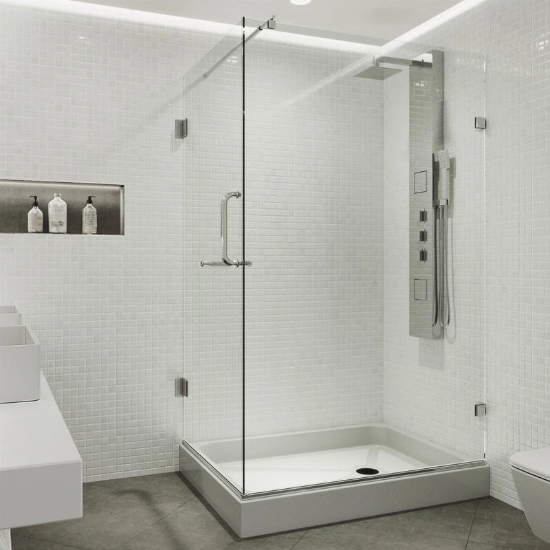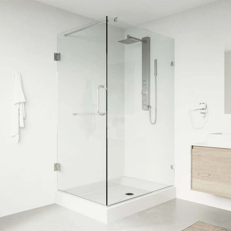 With touches of hardware, the Pacifica by VIGO delivers a sophisticated aesthetic for any bath design. Premium 7-layer finished hardware adds sleek texture to thick tempered glass. Designed for corner installations, this shower enclosure accommodates a variety of spaces and provides a spacious layout. Engineered with proprietary technology, it marries innovation with style to create an exceptional shower enclosure. The curved handle doubles as a towel bar and assists in seamless walk-in shower entry. The Pacifica invites you to step into a peaceful spa-like oasis.