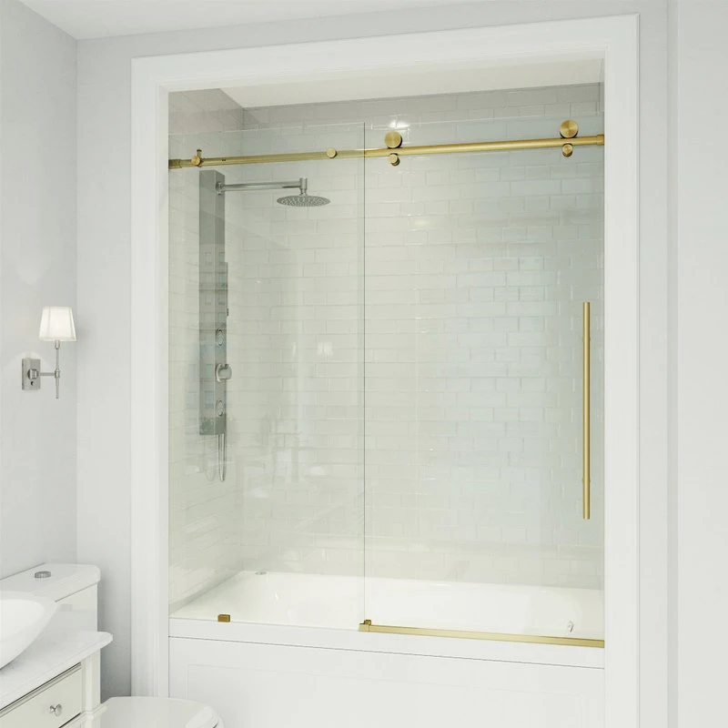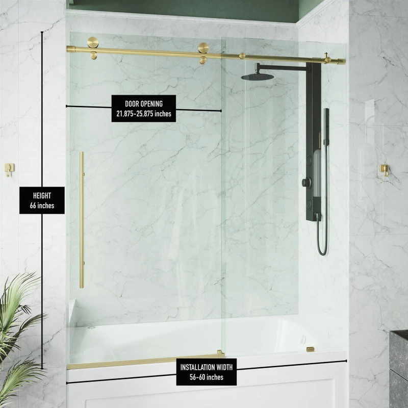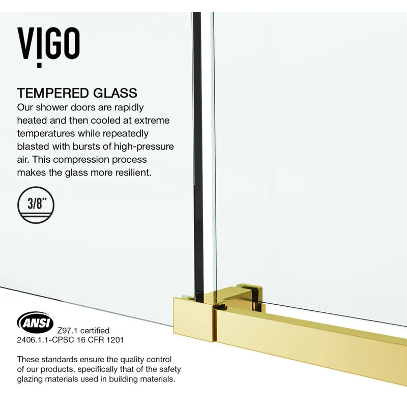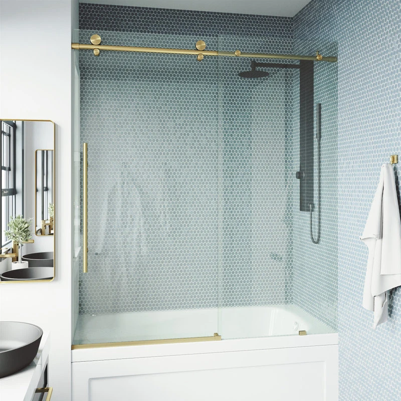 The VIGO Elan E-class Frameless Sliding Bathtub Door. Introduce a modern aesthetic to your bathroom with premium stainless-steel construction and eye-catching roller disks. Crafted with high-quality tempered glass and stainless steel hardware in matte brushed gold finish, Elan E-class will be a long-lasting component of your home. The glass door supports either a left-side or right-side opening installation. The single water deflector redirects water toward the inside of the tub, and the full-length seal strips make the bathtub waterproof. Elan E-class allows 4 inches of horizontal adjustability, making this a perfect fit for any bathroom layout.