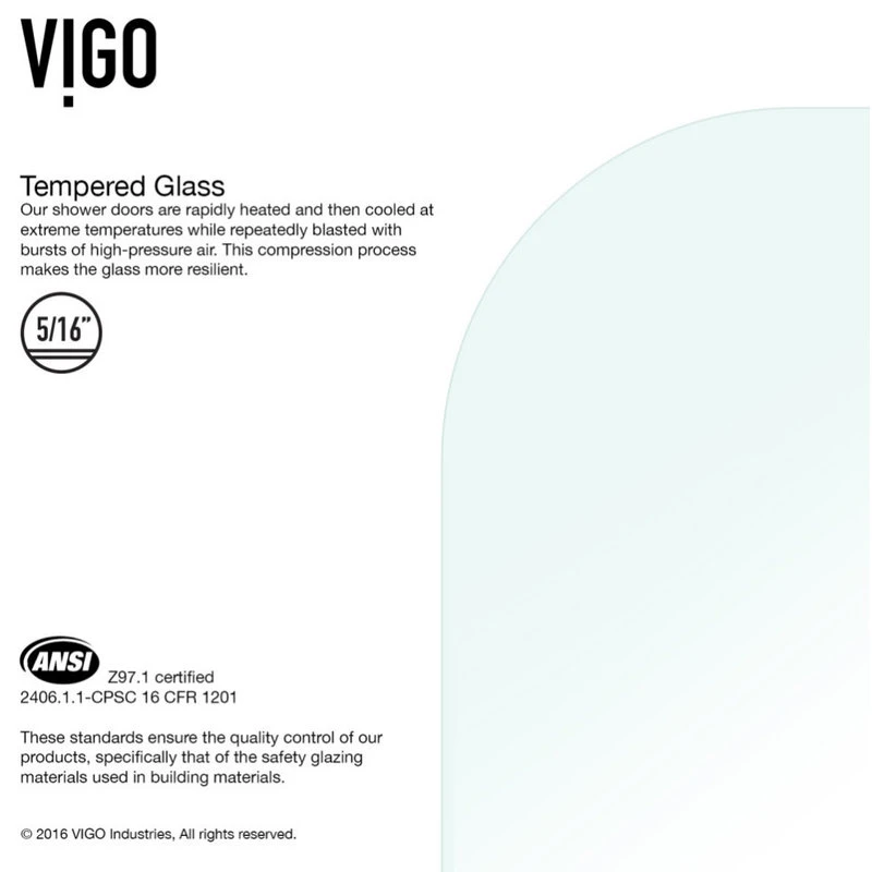 - Tempered glass is 5/16-inch thick and ANSI Z97.1 and 16 CFR 1201 certified;