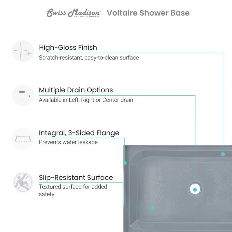 The Voltaire Shower Base is a powerful and stylish statement in any bathroom. Its practical design and low threshold provide easy access to the shower. The durable acrylic and fiberglass reinforcements make the shower base a robust selection.