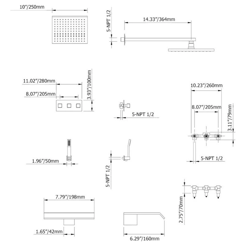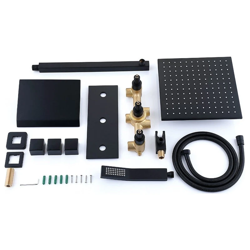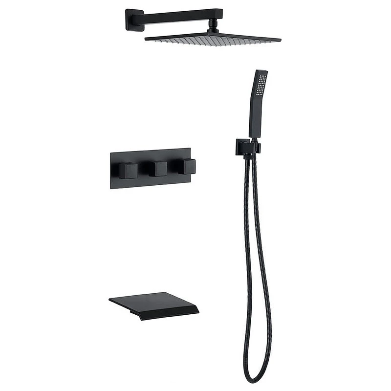 SKU: HZ-J021007-US-MB-10IN Category: Bathroom Faucets Tags: 10" shower head, 3 function shower fixture, Bathroom shower sets, Matte black shower system, Rainfall shower, Shower System with Hand Shower, Shower system with tub spout, Solid Brass Shower System, Wall mount shower